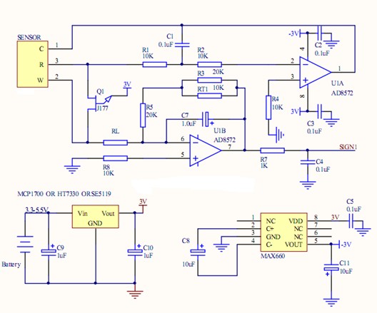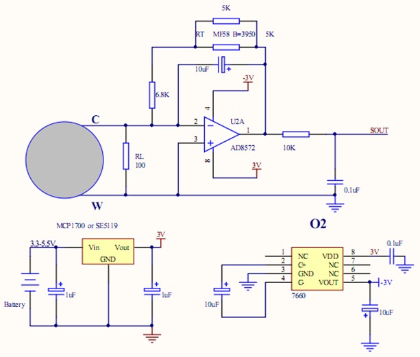 双电极电化学传感器应用电路Dual electrode electrochemical sensor application circuit三电极电化学传感器应用电路(零偏压)Three electrode electrochemical sensor application circuit(zero bias)电化学氧气气体传感器(0~25%)Electrochemical oxygen gas sensor(0~25%)